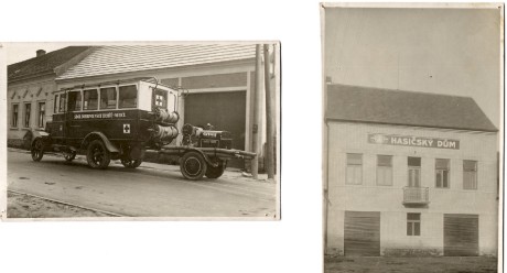 První vozidlo zakoupeno v roce 1930 od ministerstva pošt se zapřaženou motorovou stříkačkou. Hasičský dům postavený na tržišti v roce 1930.